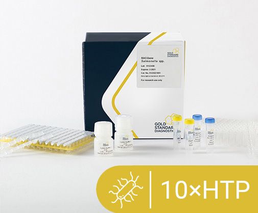 The BACGene Salmonella spp. 10x HTP kit is designed for rapid detection of Salmonella spp. DNA in food, feed (including pet food) and environmental samples, includes materials for 10 x 96 lysis and PCR reactions. This kit is designed for high-throughput with larger amounts of samples.