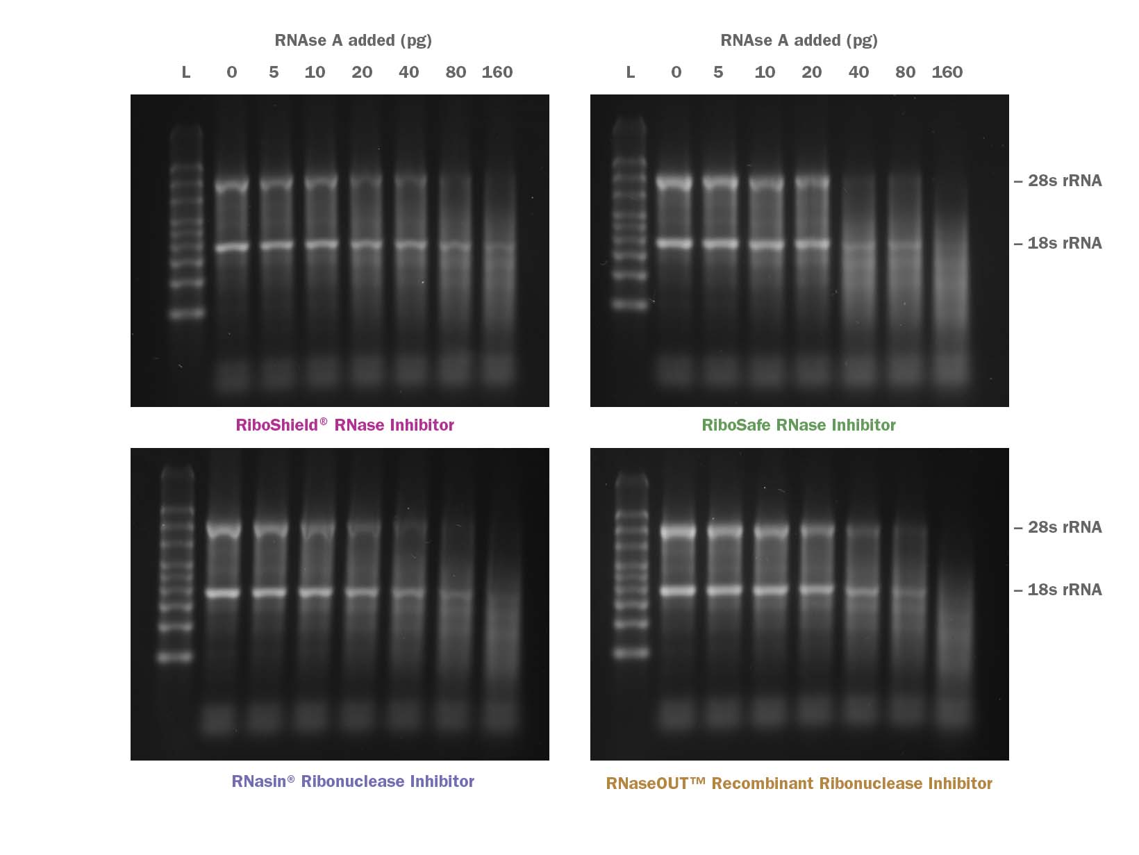 RiboShield® RNase Inhibitor có trọng lượng phân tử là 50 kDa và được tinh chế từ các tế bào côn trùng High Five biểu hiện một gen placental người đã được sửa đổi. Chất ức chế liên kết không cộng hóa trị với các RNase theo tỷ lệ 1:1, và có giá trị Ki khoảng 10–14 M khi liên kết với RNase A1. Hơn nữa, động lực liên kết rất nhanh với các RNase đảm bảo bảo vệ tức thì cho RNA của bạn.