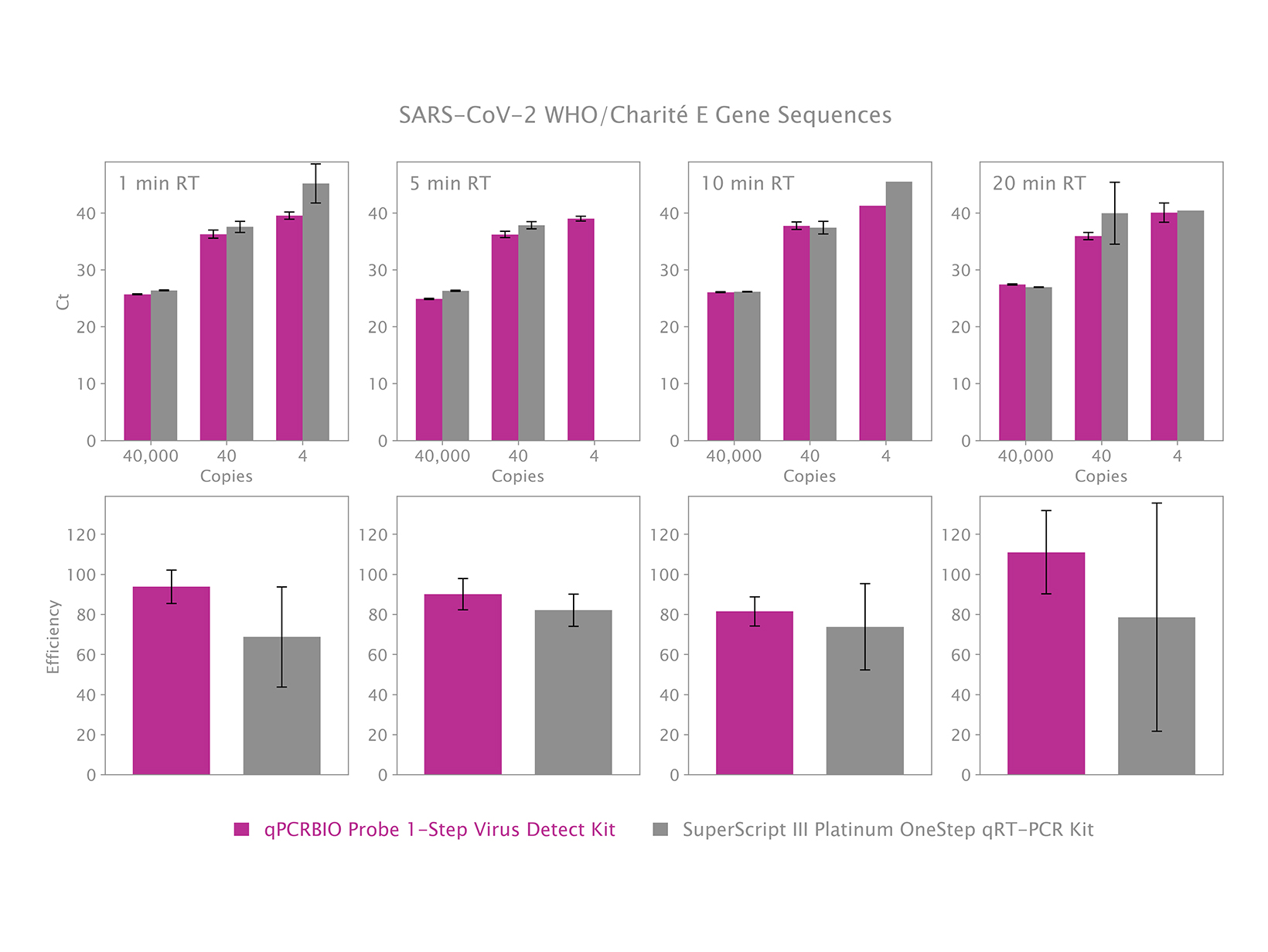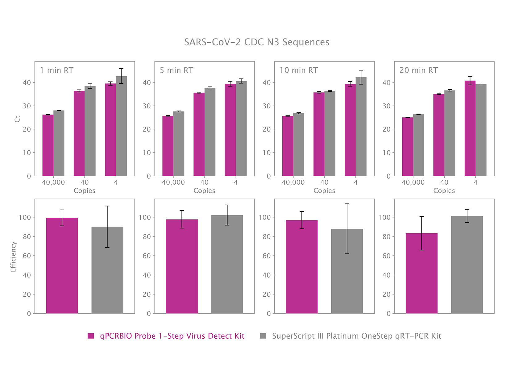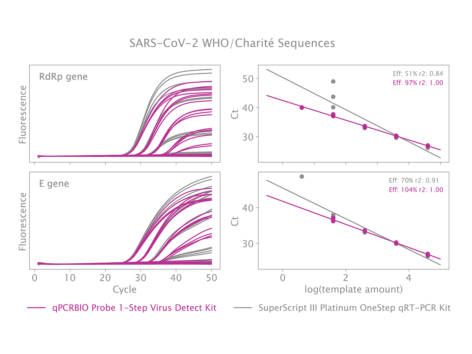 qPCRBIO Probe 1-Step Virus Detect được tối ưu hóa và xác nhận sẵn cho việc phát hiện định tính axit nucleic của SARS-CoV-2 và rất phù hợp cho các xét nghiệm COVID-19 quy mô lớn, bất kể qua các xét nghiệm phát triển trong phòng thí nghiệm hay như một thành phần của bộ kit chẩn đoán. Việc xác nhận đã được thực hiện sử dụng các trình tự mồi-probe được khuyến nghị bởi Charité (Berlin, Đức) (gen RdRp và E), và các trình tự mồi-probe của Trung tâm Kiểm soát và Phòng ngừa Dịch bệnh (Atlanta, Mỹ) (gen N).